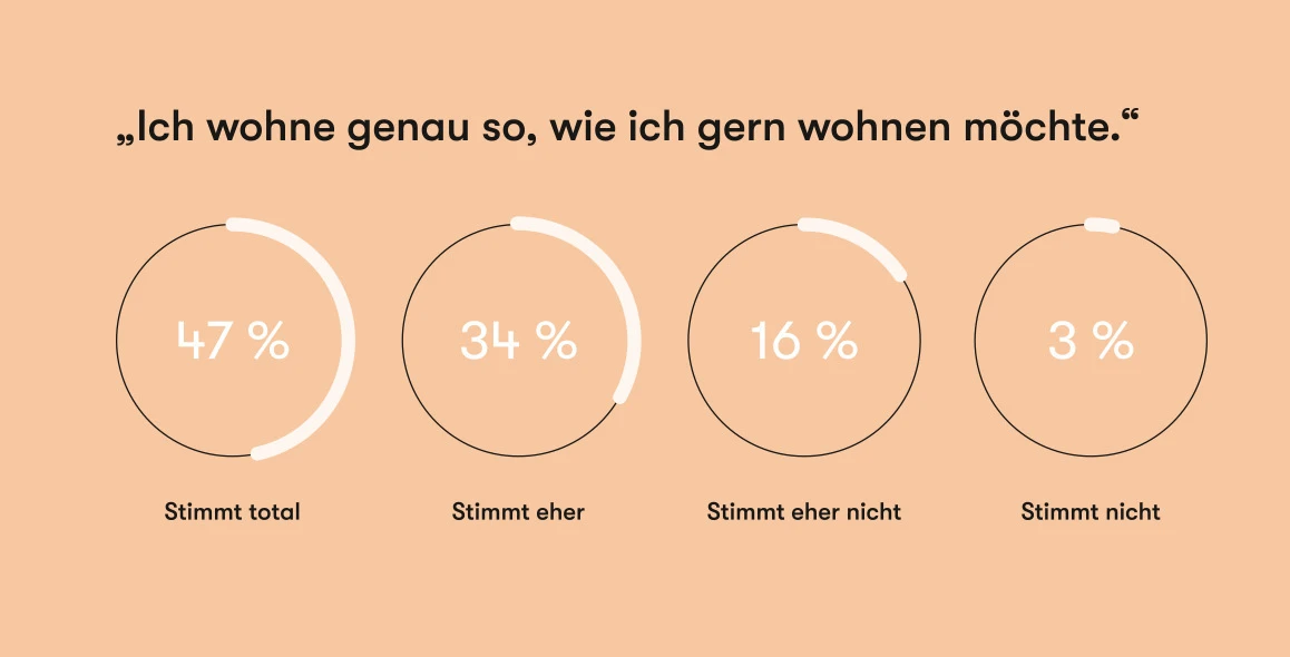 - Laut Umfrage wohnen die meisten Befragten genau so, wie sie möchten. 34 Prozent stimmen dieser Aussage voll und ganz zu, während knapp die Hälfte (47 Prozent) eher zustimmt.