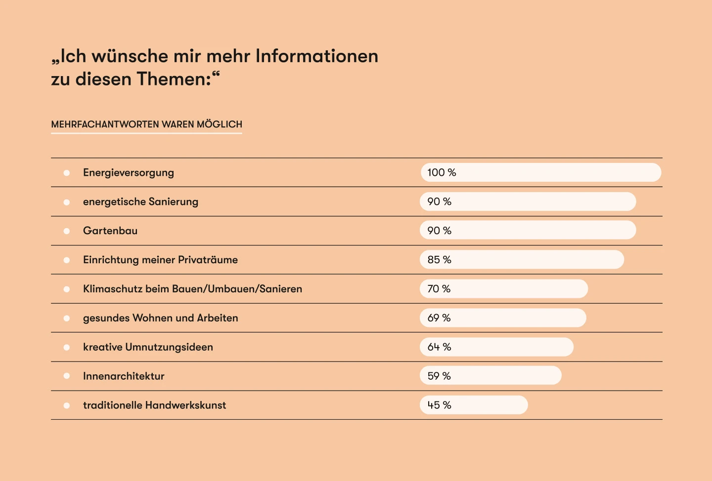 - Die Befragten äußern ein starkes Interesse an Informationen rund um das Bauen, insbesondere zu den Themen Energieversorgung, energetische Sanierung und Gartenbau.