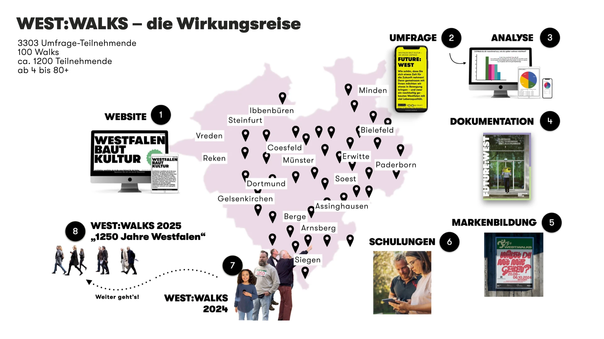 Bewusste Selbstwirksamkeit in der Alltagswelt. Oder: Rund 50 % aller Bauentscheidungen werden privat gefällt. Der Verein WESTFALEN BAUEN KULTUR möchte die Menschen Westfalens mit den WEST:WALKS für eine höhere Qualität in der gebauten Umwelt begeistern. Das Festival setzt auf Dialoge und Hands-on-Wissensaustausch. Es schärft den Blick für den persönlichen, gesellschaftlichen und ökologischen Wert guter Räume. Beim gemeinsamen Gehen werden viele Perspektiven sichtbar und verständlich gemacht, während unterschiedliche Bedürfnisse zur Sprache kommen und aufeinandertreffen. So entsteht eine lernende Community, die Augenhöhe lebt, neue Netzwerke bildet und die gebaute Umwelt durch Wertschätzung und achtsame Entscheidungen nachhaltig verbessert.